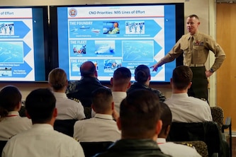230112-N-OR809-8541 ARLINGTON, VA. - (Jan. 12, 2026) - Brigadier General Samuel "lee" Meyer, Director, Expeditionary Warfare OPNAV N95, delivers remarks in the Pentagon Library and Conference Center Room during WTI Re-Blue. WTI Re-Blue is an annual U.S. Navy Warfare Tactics Instructor conference hosted by Naval Surface and Mine Warfighting Development Center that forges tactical mastery, drives doctrinal alignment and sharpens the surface force’s warfighting edge. (U.S. Navy photo by Lieutenant Jarred Reid-Dixon)