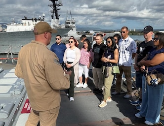 260228-N-ZI955-1011 JOINT BASE PEARL HARBOR-HICKAM, Hawaii — Lt. Cmdr. Jim Schlup, USS Shiloh (CG 67) operations officer, provides a tour of his ship to visitors from the U.S. Army’s 84th Engineer Battalion Senior Spouses Group and their family members during a tour aboard the Ticonderoga-class, guided-missile cruiser, Feb. 28, 2026. Shiloh Sailors hosted the group as part of the Navy Region Hawaii and Naval Surface Group Middle Pacific shipboard tour program. The program provides local civic, military and school groups the opportunity to visit U.S. Navy ships and learn about the important role they conduct to maintain readiness and ensure national security in the Indo-Pacific region. (U.S. Navy photo by Daniel Sanford)