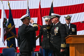 260403-N-IF204-1410 Capt. Christopher Petro relieves Capt. Matthew Ventimiglia as commanding officer of San Antonio-class amphibious transport dock ship USS Anchorage (LPD 23) during a change of command ceremony aboard the ship, April 3, 2026. Anchorage is currently homeported in San Diego. (U.S. Navy photo by Mass Communication Specialist Third Class Zachary Costan)