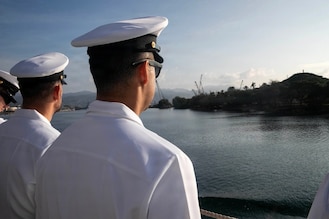 251129-N-VM650-1011 U.S. Navy Senior Chief Culinary Specialist Miguel Escajeda mans the rails aboard the Arleigh Burke-class guided-missile destroyer USS Wayne E. Meyer (DDG 108) while entering Pearl Harbor, Hawaii, Nov. 29, 2025. Wayne E. Meyer returned to its homeport of Pearl Harbor following nine months underway in the U.S. 3rd, 5th and 7th Fleet areas of operations. U.S. 3rd Fleet works together with allies and partners to advance freedom of navigation and overflight, the rule of law and other principles that underpin security for the Indo-Pacific region. (U.S. Navy photo by Mass Communication Specialist 1st Class Charles J. Scudella III)