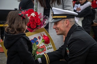 251212-N-AS506-1792 U.S. Sailors attached to the Arleigh Burke-class guided-missile destroyer USS Gridley (DDG 101) embrace with families after returning to their homeport in Everett, Washington, after a nine-month deployment in the U.S. 5th and 7th Fleet area of operations, Dec. 12, 2025. Gridley, assigned to the Nimitz Carrier Strike Group, is in port conducting routine operations. (U.S. Navy photo by Mass Communication Specialist 2nd Class Timothy Meyer)