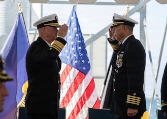 260220-N-UJ449-1562 Capt. Jose Roman, right, requests permission to go ashore for the final time from Vice Adm. Brendan McLane, commander, Naval Surface Force, U.S. Pacific Fleet, during a change of command and retirement ceremony on Naval Base San Diego, Feb. 20, 2026. Littoral combat ships are fast, optimally-manned, mission-tailored surface combatants that operate in near-shore and open-ocean environments, winning against 21st-century coastal threats. (U.S. Navy photo by Mass Communication Specialist 1st Class Josh Coté)
